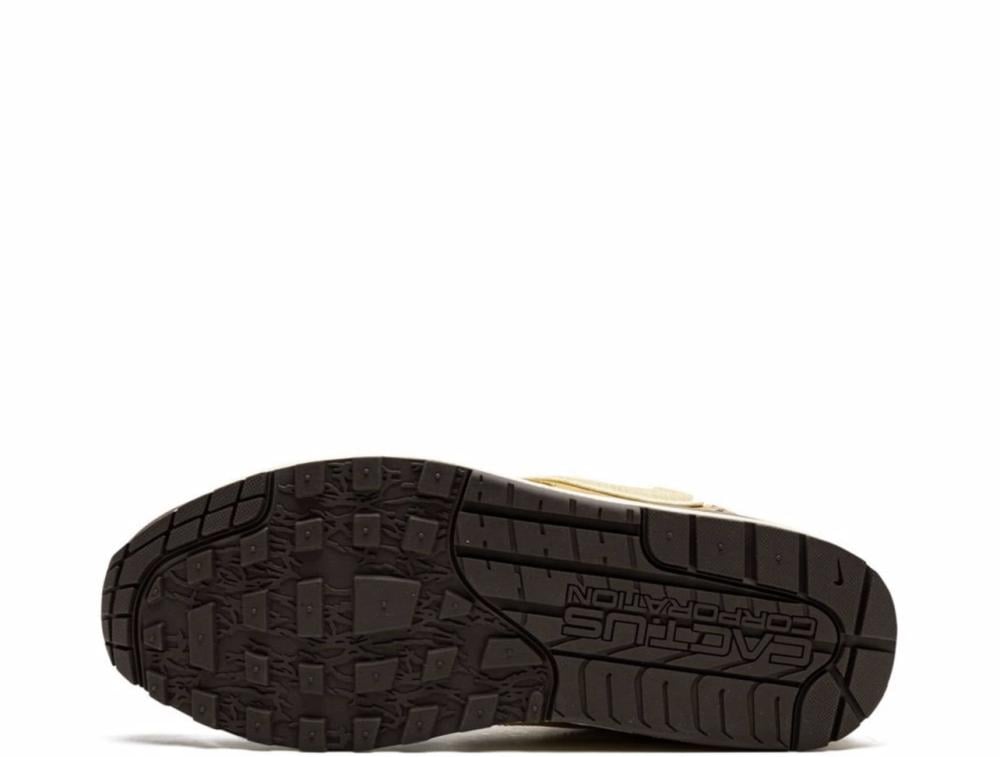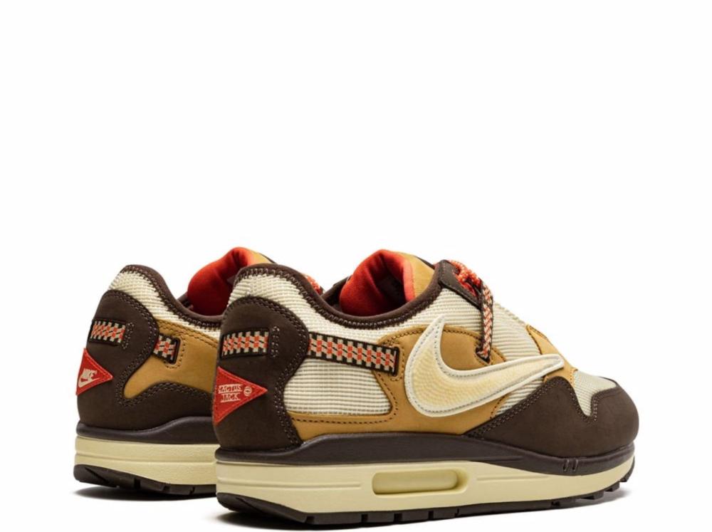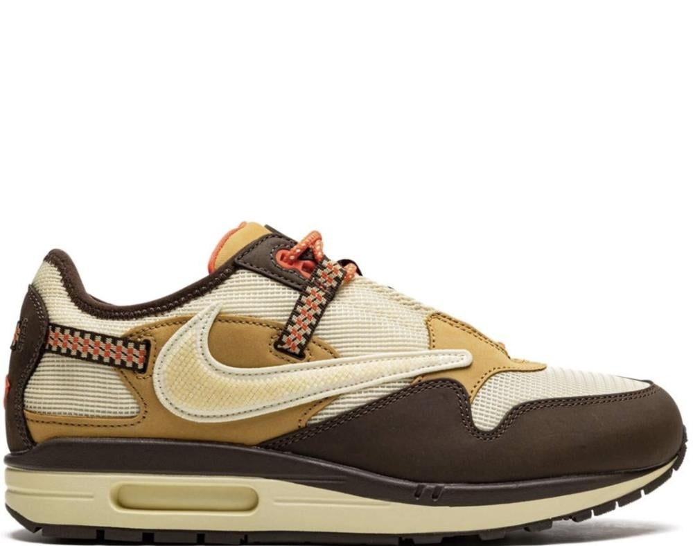 The Travis Scott x Nike Air Max 1 “Baroque Brown” is a limited-edition collaboration between the hip-hop artist and Nike that adds some new details to the iconic sneaker. This version presents a tonal look and features a Lemon Drop-colored mesh construction with brown leather overlays on the mudguard, toe and heel. Scott’s signature inverted Swoosh is embroidered on the lateral side while the Swoosh on the medial side faces the correct, original direction. Pocket knife-inspired straps with geometric detailing appear on the collar and heel, while red rope laces found on the tongue feature speckle detailing. The 'Nike' and 'Cactus Jack' branding can be seen on the left and right shoe, respectively.